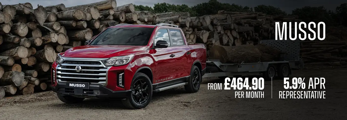 *Offer available on Musso models ordered by 30/06/26 [and registered by 30/06/26]. 5.9% APR PCP example based on a 48 month term with a 25% customer deposit. The model variant shown is for illustrative purposes only. Accessories may also be featured that are not standard fit. With KGM Financial Services PCP, you may return the vehicle instead of making the final payment. It must be in good condition and, if you exceed the agreed annual mileage, you will be charged 18p per mile for exceeding 9,000 miles p.a. in this example. Subject to status. Guarantees may be required. T&Cs apply. Offer may be varied or withdrawn at any time. Participating retailers only. Your retailer will usually receive a fixed percentage commission for introducing customers to KGM Financial Services. CA Auto Finance UK Limited trading as KGM Financial Services, PO Box 4465, Slough, SL1 0RW.
