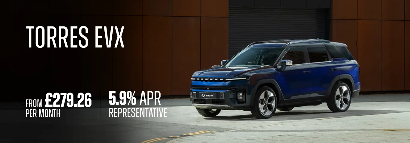*Offer available on Torres EVX models ordered by 30/06/26 [and registered by 30/06/26]. 5.9% APR PCP example based on a 48 month term with a 25% customer deposit. The model variant shown is for illustrative purposes only. Accessories may also be featured that are not standard fit. With KGM Financial Services PCP, you may return the vehicle instead of making the final payment. It must be in good condition and, if you exceed the agreed annual mileage, you will be charged 16p per mile for exceeding 9,000 miles p.a. in this example. Subject to status. Guarantees may be required. T&Cs apply. Offer may be varied or withdrawn at any time. Participating retailers only. Your retailer will usually receive a fixed percentage commission for introducing customers to KGM Financial Services. CA Auto Finance UK Limited trading as KGM Financial Services, PO Box 4465, Slough, SL1 0RW.