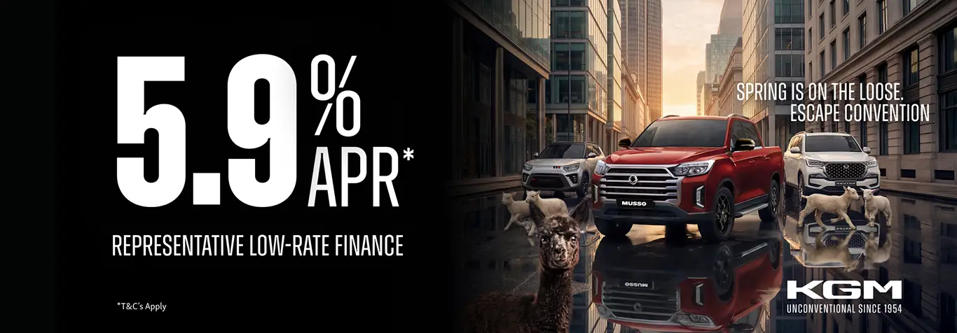 *Offer available on Musso models ordered by 30/06/26 [and registered by 30/06/26]. 5.9% APR PCP example based on a 48 month term with a 25% customer deposit. The model variant shown is for illustrative purposes only. Accessories may also be featured that are not standard fit. With KGM Financial Services PCP, you may return the vehicle instead of making the final payment. It must be in good condition and, if you exceed the agreed annual mileage, you will be charged 18p per mile for exceeding 9,000 miles p.a. in this example. Subject to status. Guarantees may be required. T&Cs apply. Offer may be varied or withdrawn at any time. Participating retailers only. Your retailer will usually receive a fixed percentage commission for introducing customers to KGM Financial Services. CA Auto Finance UK Limited trading as KGM Financial Services, PO Box 4465, Slough, SL1 0RW.